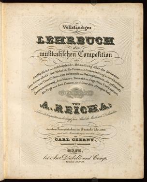 Dans son Traité de Mélodiepublié en 1814 Reicha insiste – à l’opposé de Rousseau – sur le fait que « le grand édifice de la Musique repose sur deux colonnes de même grandeur et d’une égale importance, la Mélodie et l’Harmonie. » Selon lui l’harmonie agencée avec intelligence peut produire par elle-même toutes sortes d’émotions et en même temps contribuer à perfectionner la mélodie. Comme les théoriciens d’autrefois ont peiné à définir la mélodie en parlant de ses qualités au lieu d’en décrire la matérialité, Reicha se contente de parler d’une « succession de sons », de la « syntaxe mélodique » par les « gammes, les intervalles, les modulations… ». Et c’est précisément sur le plan de la modulation (son cheval de bataille dans les fugues) qu’il voit l’impact de l’harmonie sur la ligne mélodique. Ce traité sera vite diffusé en Europe, tout comme les ouvrages suivants : le Petit traité d’harmonie pratique de 1814, le Cours de compositions musicale de 1818, le Traité de haute composition de 1824 et l’Art du compositeur dramatique ou Cours complet de composition vocale de 1833. Reicha doit la traduction allemande à son ancien élève Carl Czerny domicilié entretemps à Vienne. Czerny se propose de disposer différemment la succession des volumes pour leur donner une meilleure cohérence, en les réunissant finalement sous un titre global :